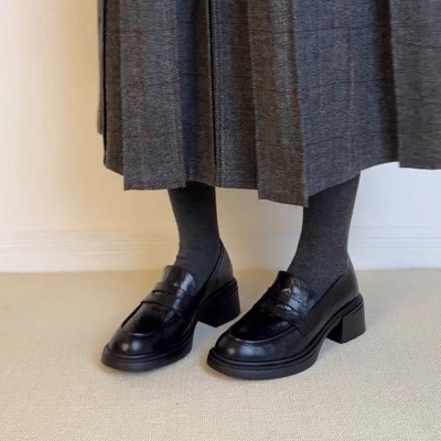 羊皮版~新款厚底复古粗跟乐福鞋女一脚蹬圆头单鞋真皮通勤小皮鞋